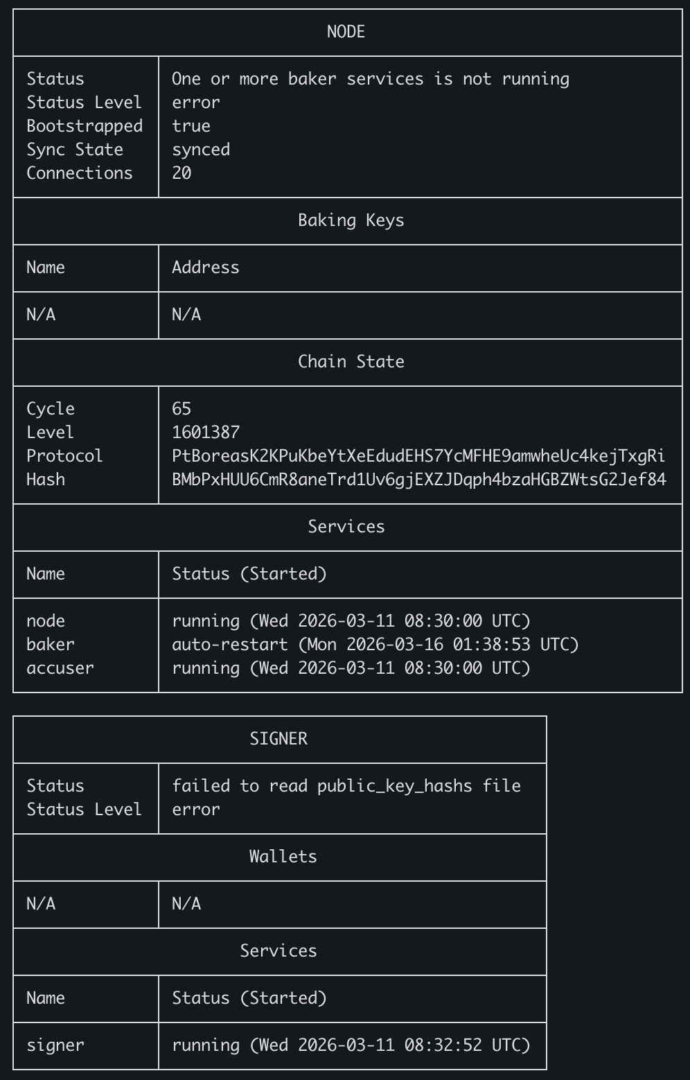 Run this command to get the status of your baker in a snapshot. After first setting up and starting the baker, you may need to give it a minute or 2 before the status display stops changing and missing some information. If you notice there is an error status on any of the fields after around 3-5 minutes of starting the services, seek out help in the Mavryk community as there is something that probably needs tweaking.