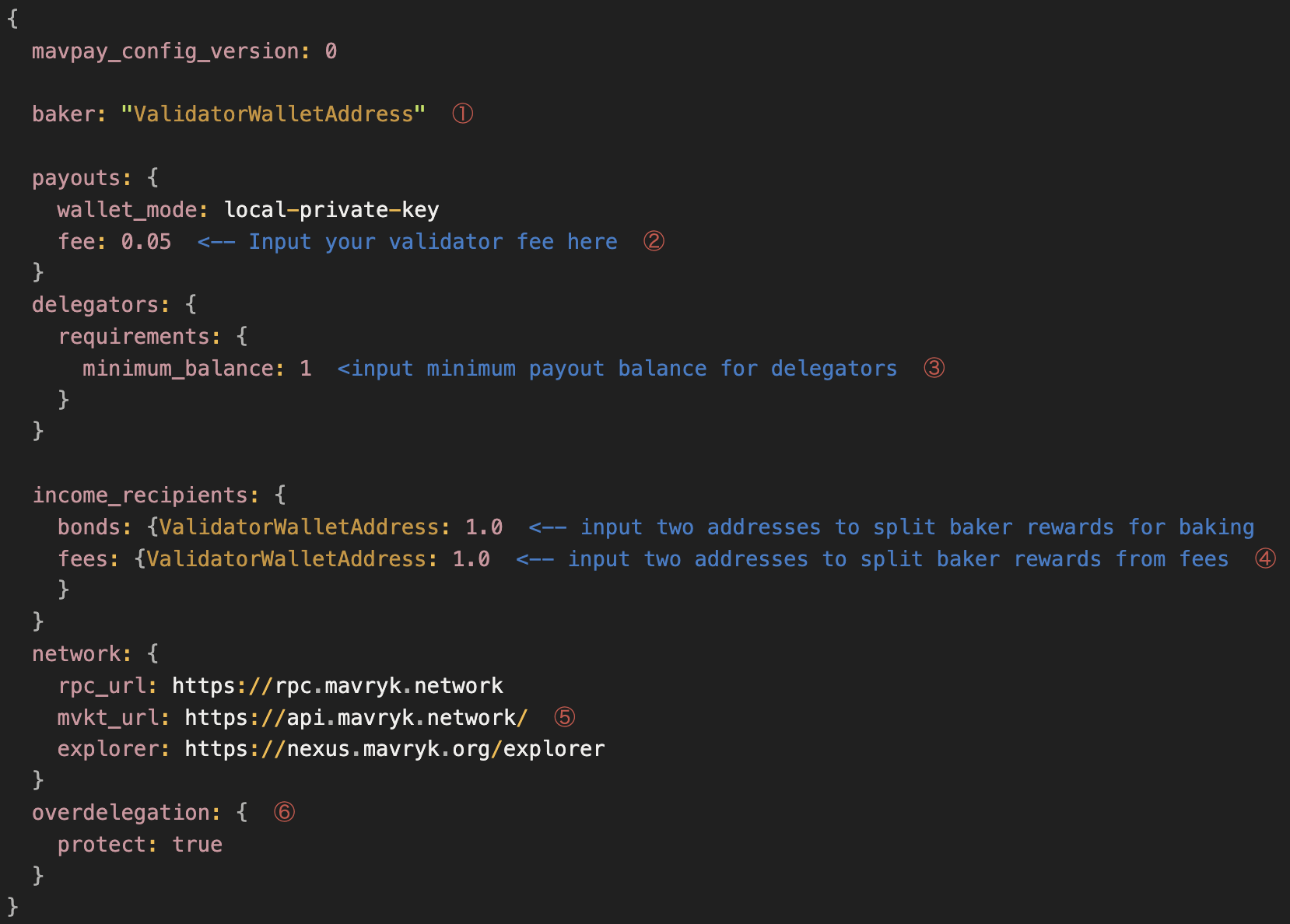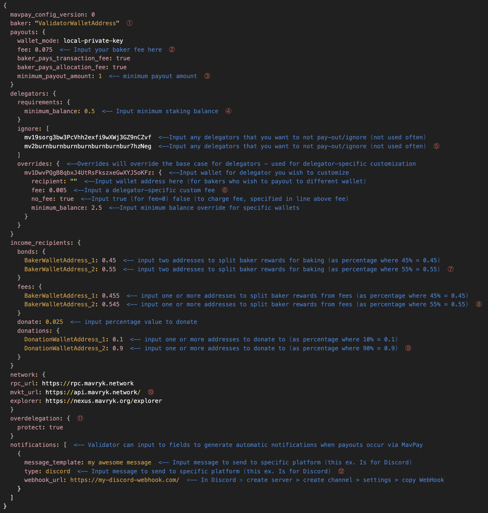 The example below is a more advanced configuration file that showcases several of the features that can be used to customize the MavPay application. To get a simple configuration file, you can remove the sections that are not needed. Here is a sample configuration that will work for 90% of bakers: (MavPay Starter Configuration)[https://bake.mavryk.org/mavpay/configuration/examples/starter/]